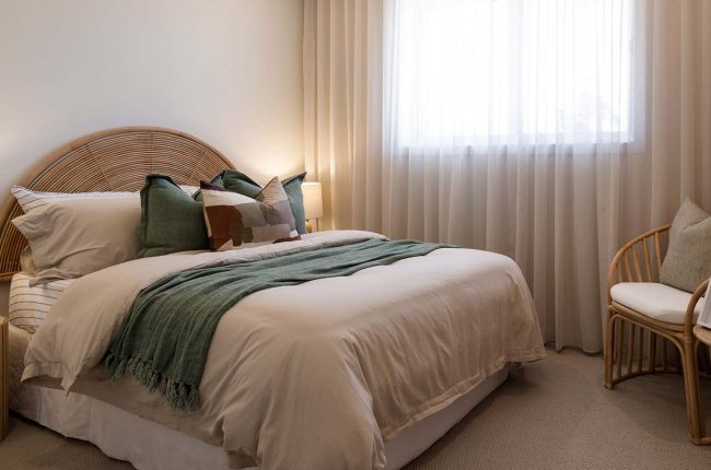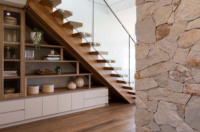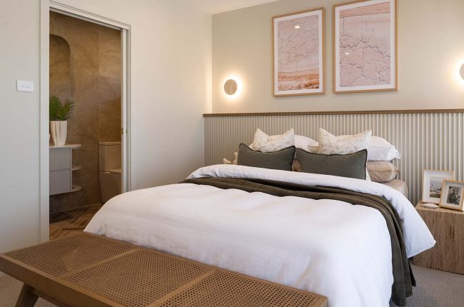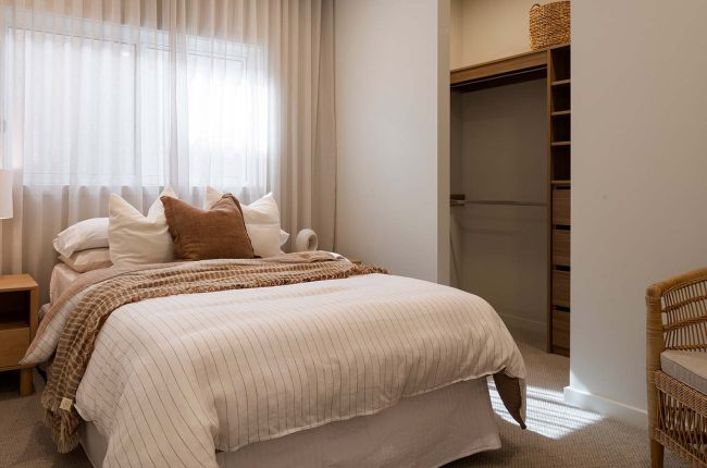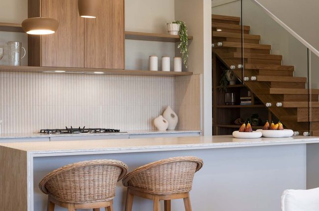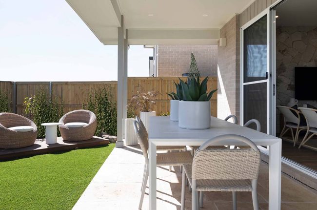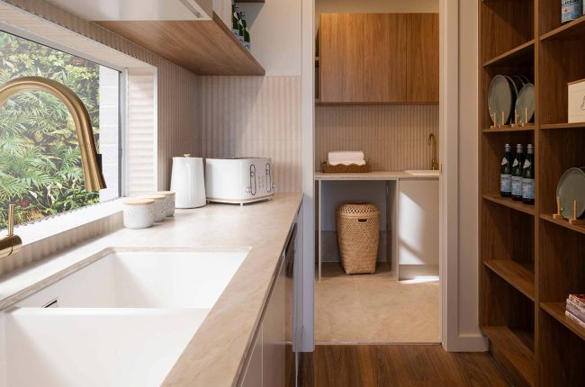 Providing ingress from the single garage, a mud room and separate store are ideal for arriving home with groceries, school bags and umbrellas. Across the hall is the laundry, closely located to the walk-in linen cupboard. Even on a narrow block, this home delivers generous living. The kitchen connects seamlessly to the Butler’s Pantry, with the kitchen and family area unfolding to the alfresco, which provides a light-filled space for living and entertaining. Plus, be inspired by an Artisan Stone ‘Organic Callala’ feature wall to the hallway and into the kitchen — providing dimension and texture to this space!