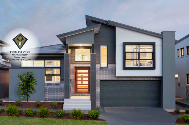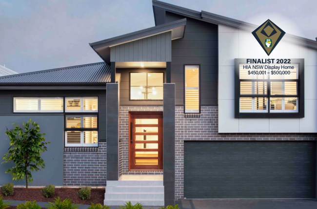 The San Tropez 273 display home at Box Hill showcases a Retro facade with a complementary mix of moody blue-toned greys that span across a striking mix of materials, such as cladding, brick, render, and tile, giving this house ample street appeal.