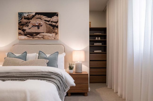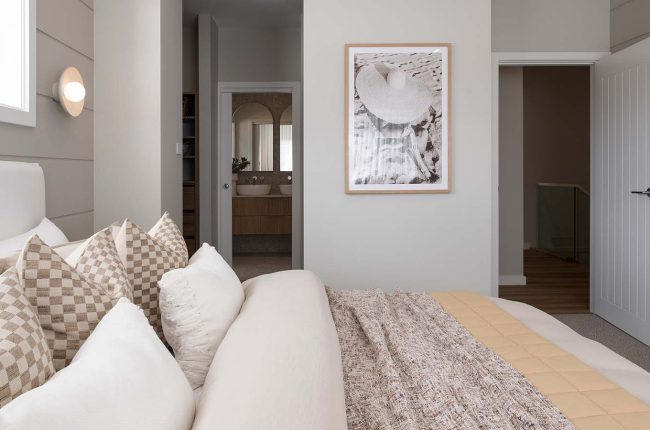 Ascend the stairs to the grand upper level, where five bedrooms and three bathrooms create a home that effortlessly accommodates every chapter of life. Afforded ultimate privacy, the master suite is located to the rear of the upper level and is complete with a dual walk-in-robe and luxurious ensuite. Coastline vibes are activated through the Scyon Stria horizontal cladding to the walls, painted in ‘Signal Station’. The remaining four bedrooms each feature a walk-in-robe, share Jack-and-Jill style ensuites and showcase feature wallpaper to inject a hint of coastline escape! Completing the upper level is a bonus rumpus room — featuring a covered outdoor deck to promote natural light and airflow.