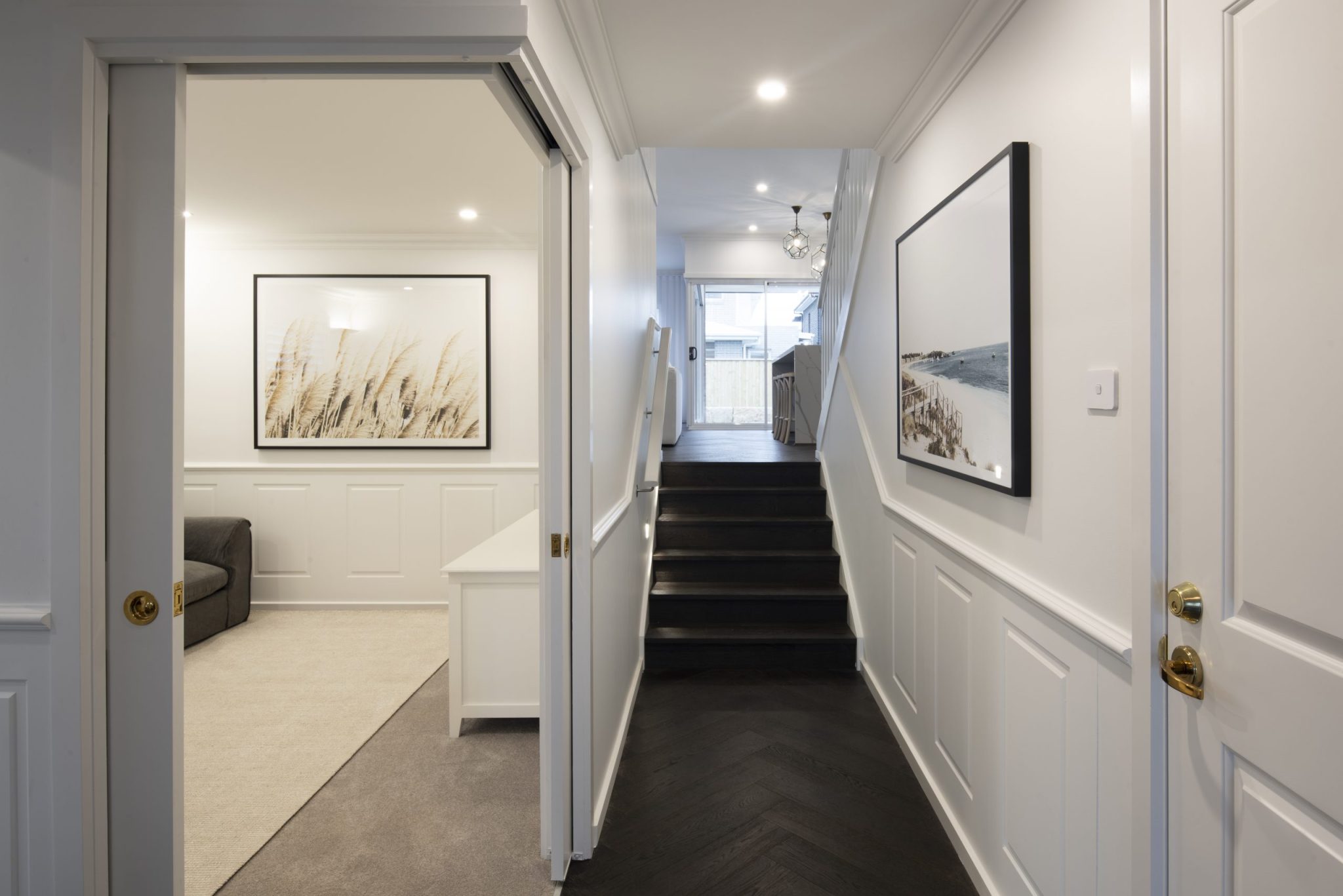 Providing privacy on the upper floor, you are greeted by the master suite, complete with a sophisticated and elegant ensuite, a generously sized walk in robe and a balcony to overlook any potential views. On this floor you’ll also find the remaining two bedrooms, and the soothing colour palette continues to the main bathroom in a minimalist white palette, adorned with a glamorous injection of gold metallic tapware and wall-hung vanities.
