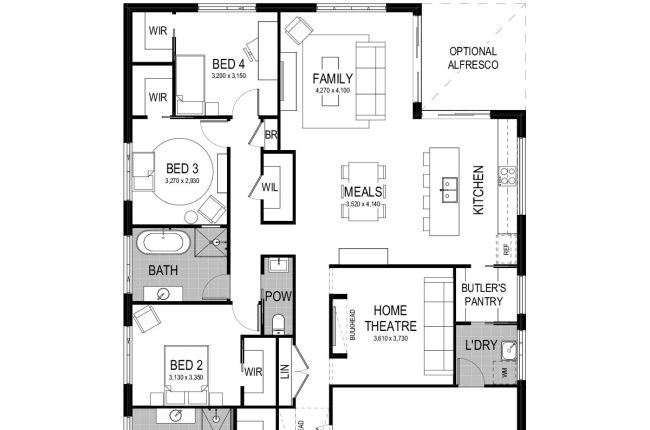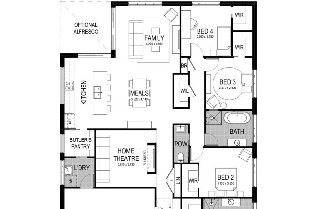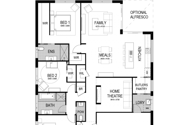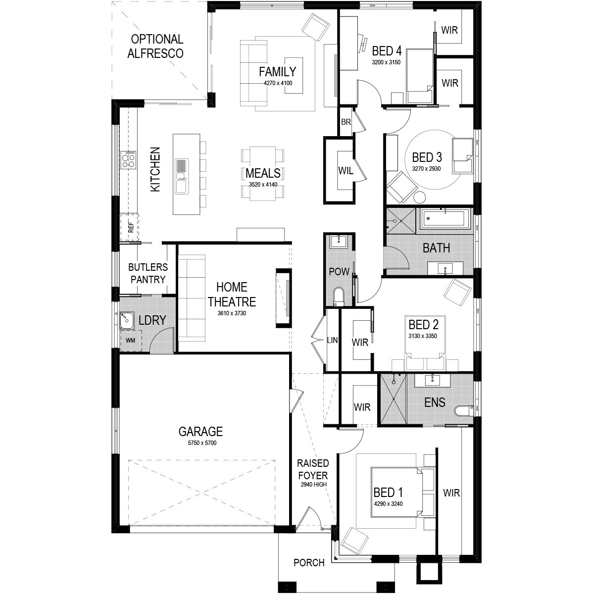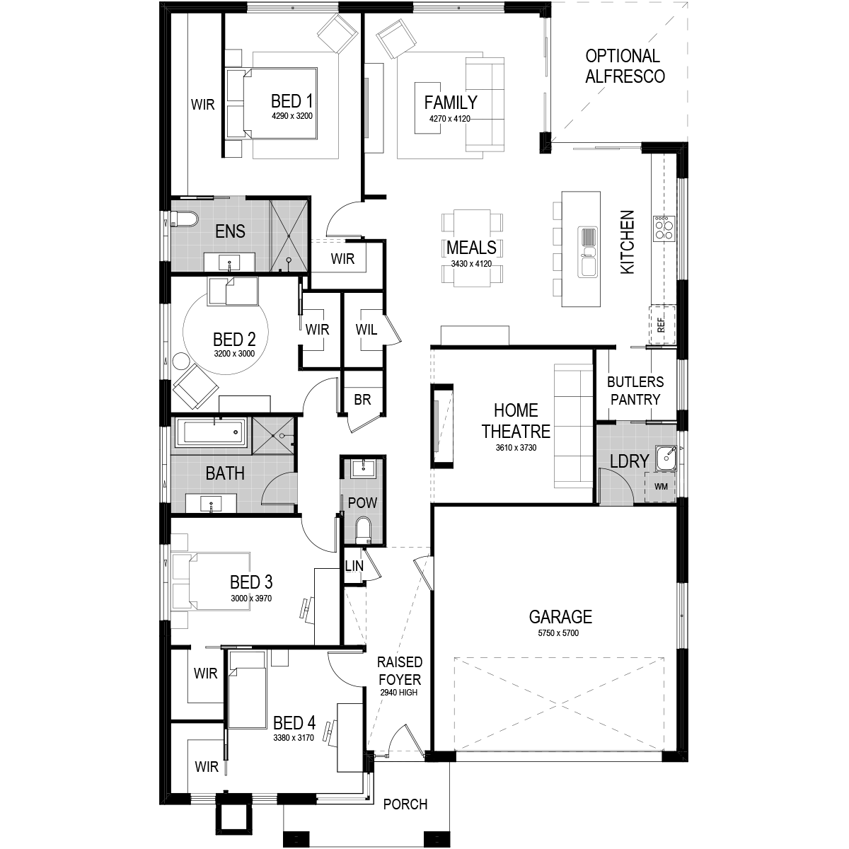 The Avalon 220 is a single storey design perfectly suited for level sites with a 14.17m frontage or wider. The design features two living areas, including a separate home theatre room, and four bedrooms.