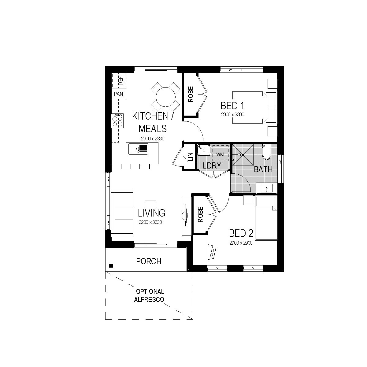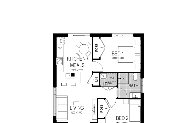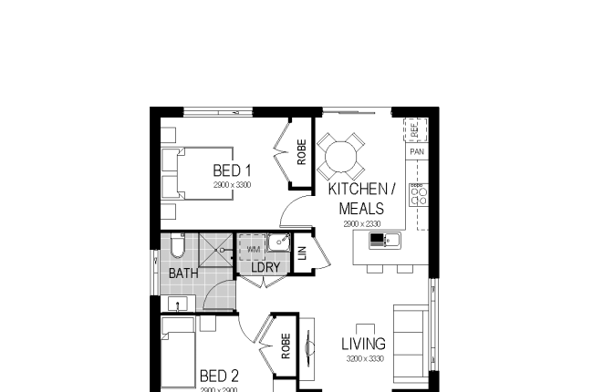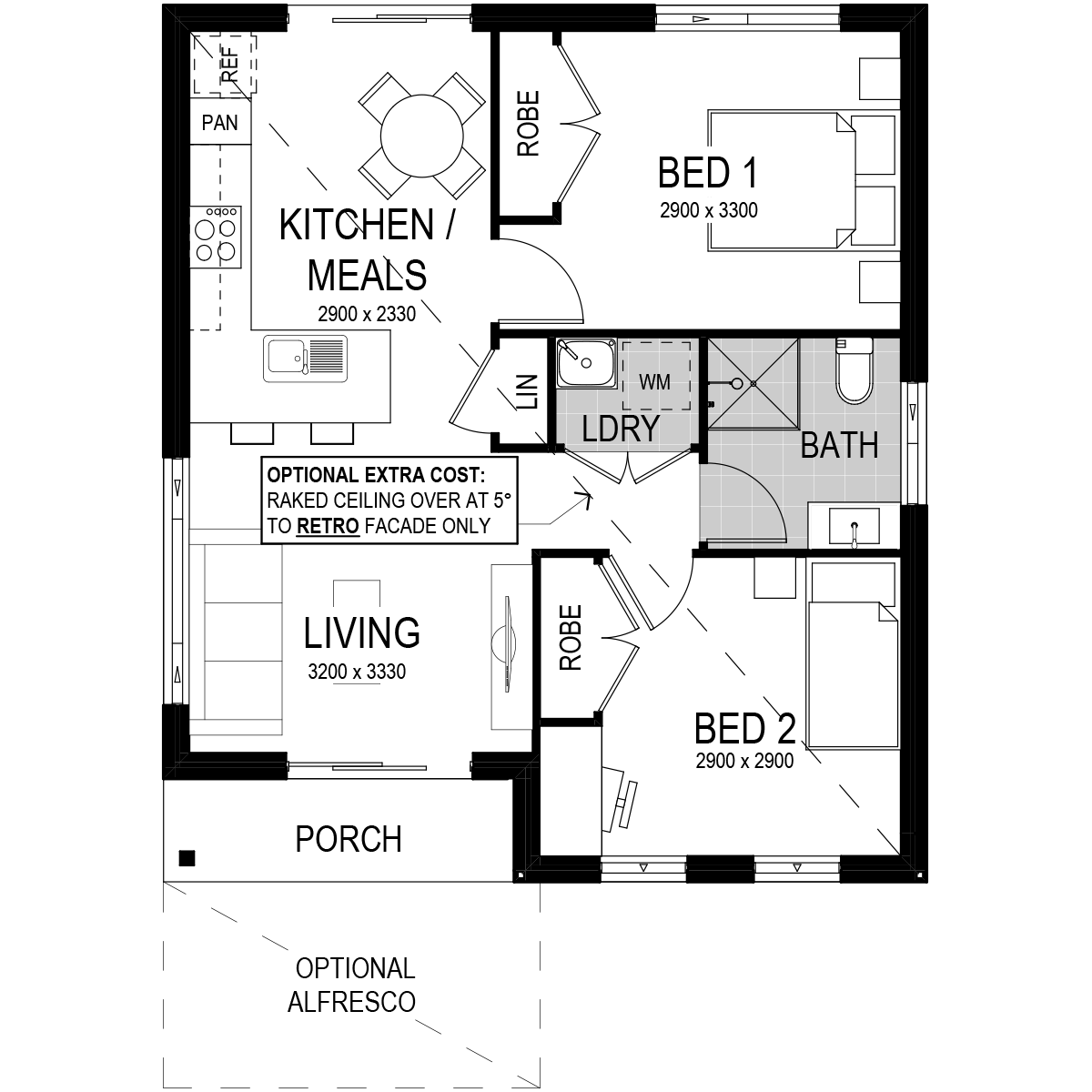 Suited for narrow blocks, The Retreat is cleverly compacted and functional. This design features a separate bathroom and laundry, positioned between bedrooms one and two for convenience, plus a separate living and meals area. This design also includes a separate linen cupboard for all your storage needs.